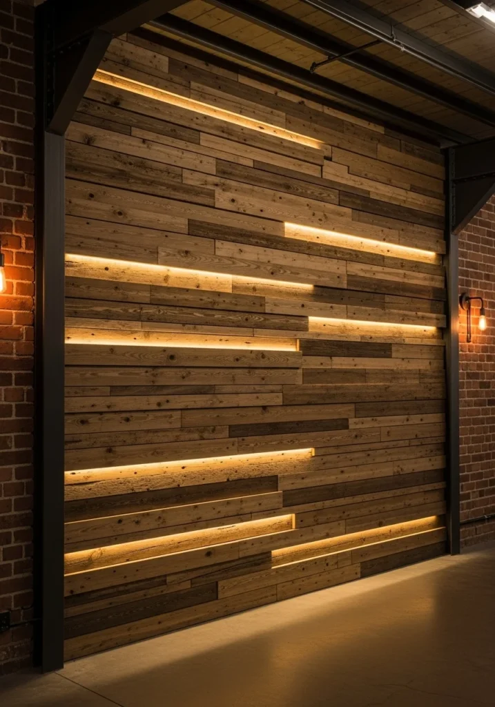 18. Urban industrial gym wall with reclaimed wood panels, warm accent lighting