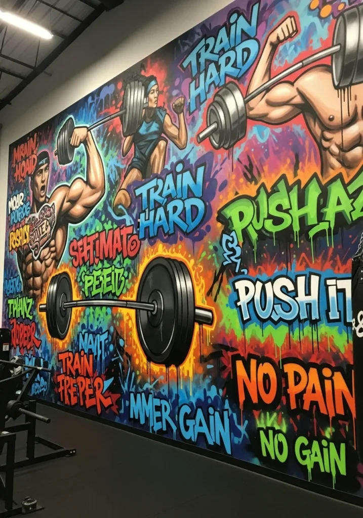 Ideal for commercial gyms, boutique fitness centers, or home studios seeking a vibrant, motivational environment, this graffiti-inspired wall fosters energy, creativity, and confidence. It combines modern art, fitness motivation, and interior design to create an immersive, visually impactful workout space.