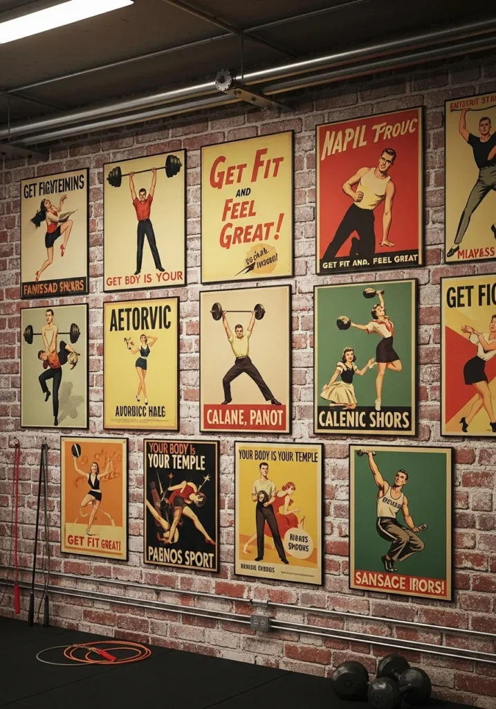 Careful arrangement of posters—framed or mounted on pinboards—creates visual cohesion and balance, turning an ordinary wall into a gallery of inspiration. The vintage aesthetic pairs well with both contemporary and industrial-style interiors, providing a warm, engaging backdrop that encourages daily exercise and perseverance.