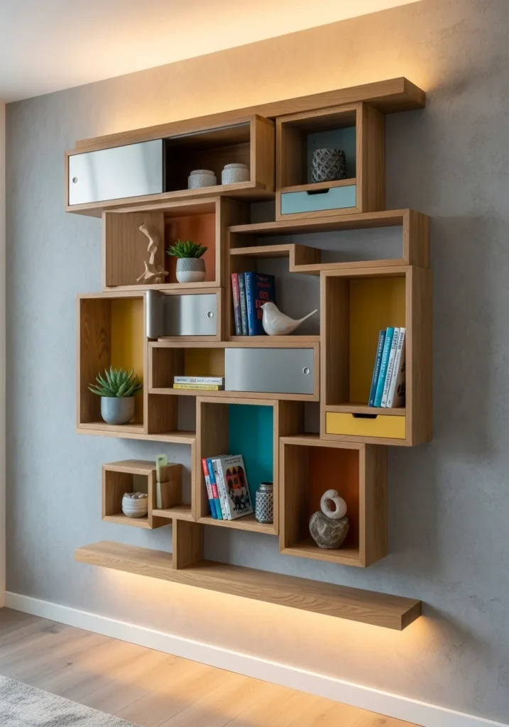 17. Wall-mounted functional art, integrated storage racks with decorative design