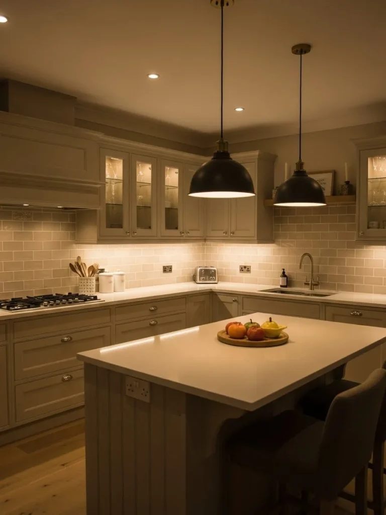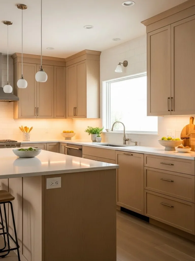 This design approach is ideal for homeowners who want their kitchen to feel both functional and relaxing. Layered lighting enhances mood, improves visibility, and elevates the overall aesthetic. The result is a warm neutral kitchen that feels cozy, stylish, and thoughtfully illuminated, making it perfect for both everyday use and intimate gatherings.