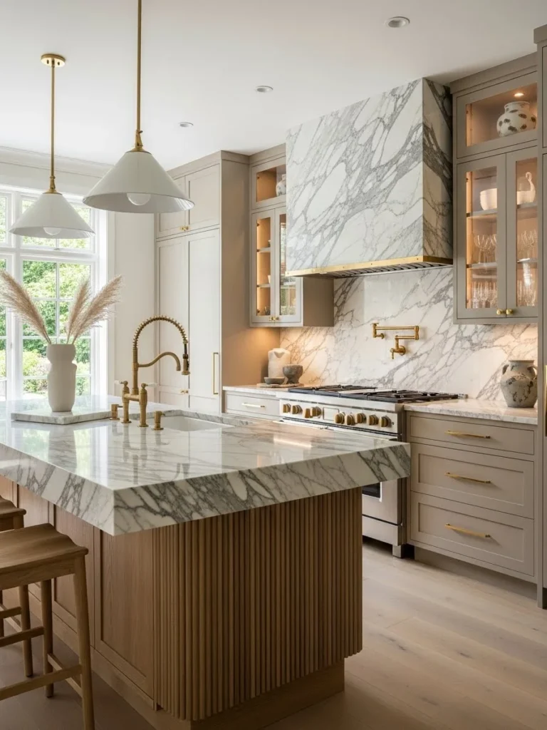 Marble countertops, backsplashes, or waterfall islands serve as luxurious focal points, grounding the space in natural artistry. Brass fixtures—such as hardware, faucets, or lighting—provide subtle luxury and complement beige, cream, and taupe tones beautifully. These elements work together to create a cohesive, high-end look without overwhelming the space.