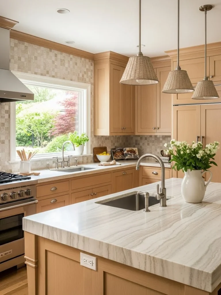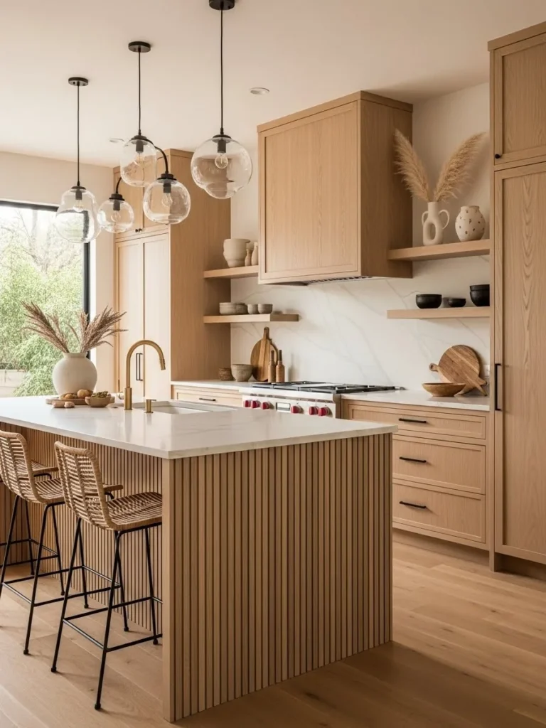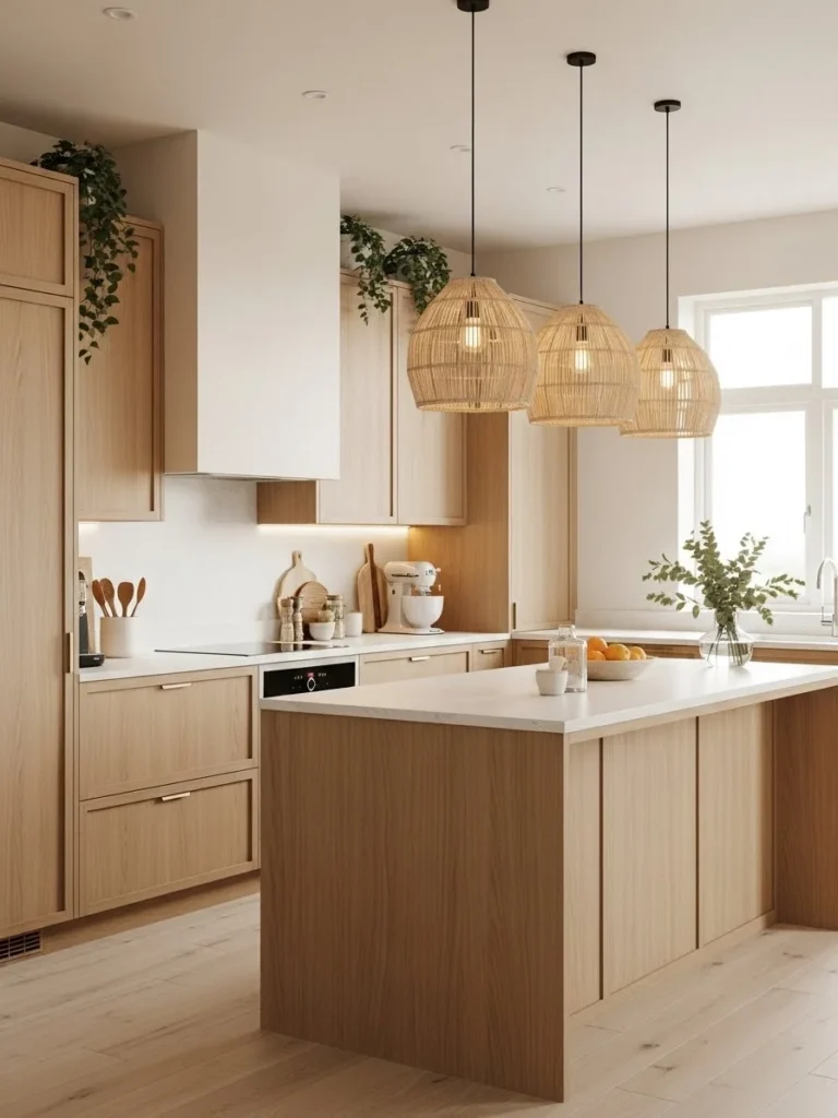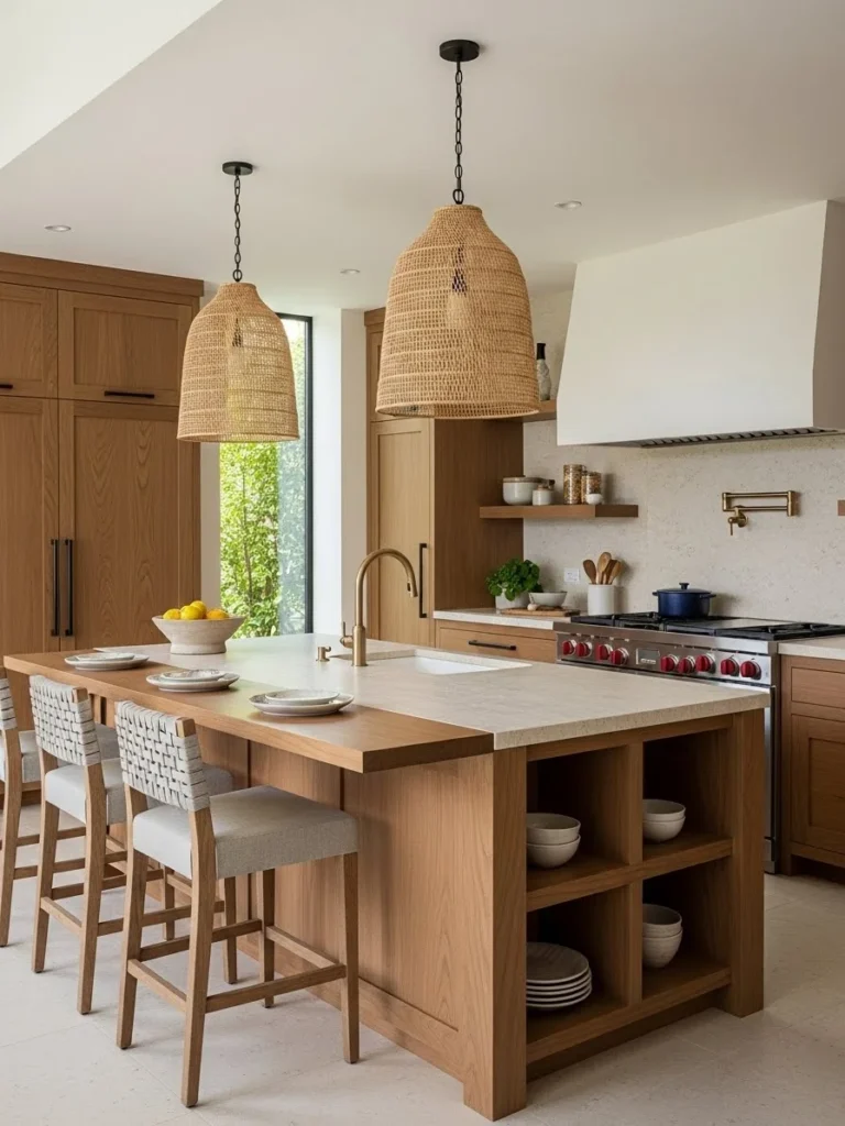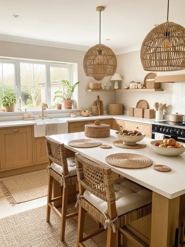 Rattan stools, wicker pendant lights, and woven baskets introduce tactile interest and visual depth. These elements pair seamlessly with wood cabinetry, stone countertops, and soft matte finishes commonly found in warm neutral kitchens. By incorporating natural fibers, the design achieves a harmonious balance between modern simplicity and rustic charm.