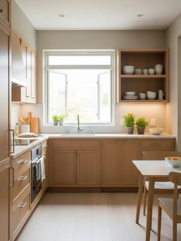 This approach is ideal for homeowners seeking to optimize both beauty and practicality in smaller kitchens. Warm neutral tones soften the space while maintaining a sophisticated look. The result is a compact kitchen that feels bright, welcoming, and thoughtfully designed.