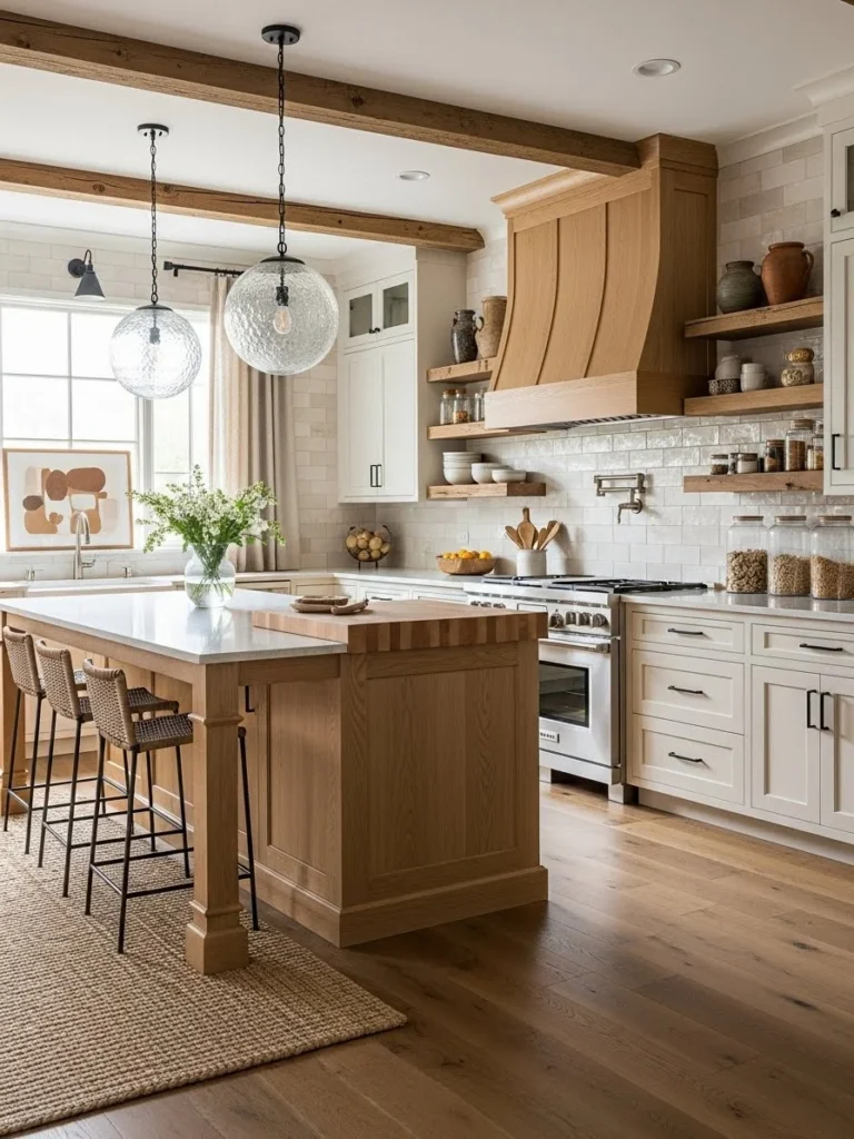 Open shelves offer opportunities to display ceramics, glassware, or natural décor, enhancing the kitchen’s personality. Warm wood shelves—whether oak, walnut, or pine—add depth and contrast to soft neutral tones. When paired with textured backsplashes or warm metals, the overall effect becomes even more inviting and cohesive.