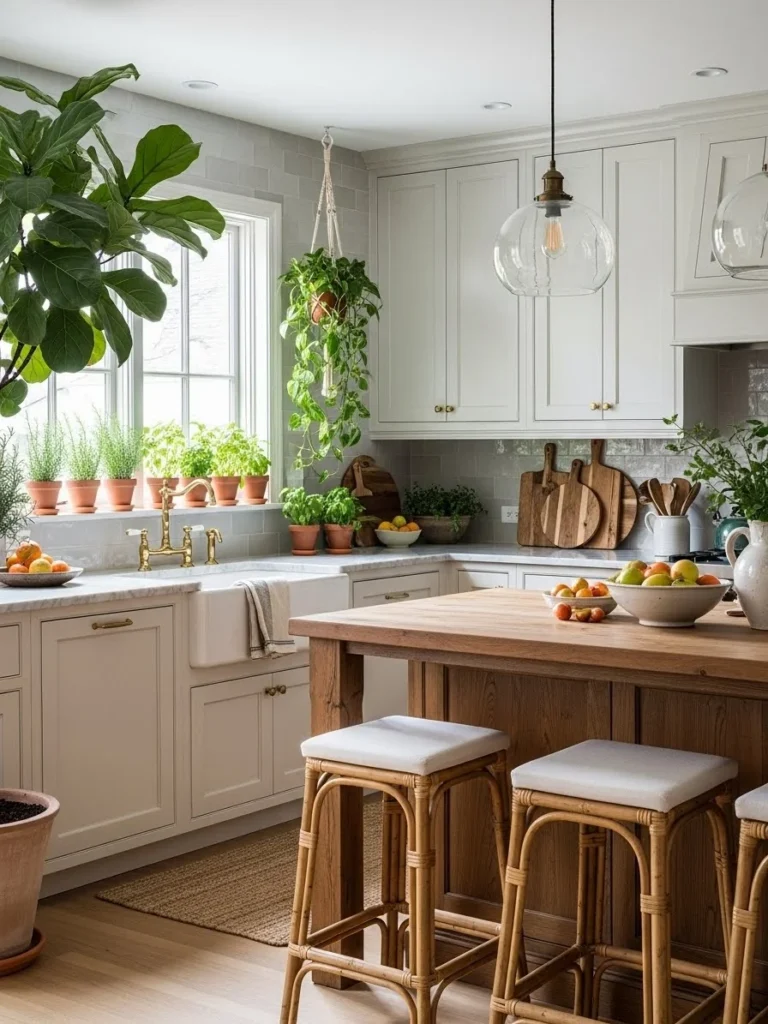 The combination of greenery and warm neutrals creates an environment that feels both stylish and restorative. Soft lighting, textured materials, and thoughtful décor choices complete the design, making the kitchen inviting and aesthetically cohesive. This style is perfect for homeowners seeking a harmonious, nature-inspired space that supports comfort and modern living.