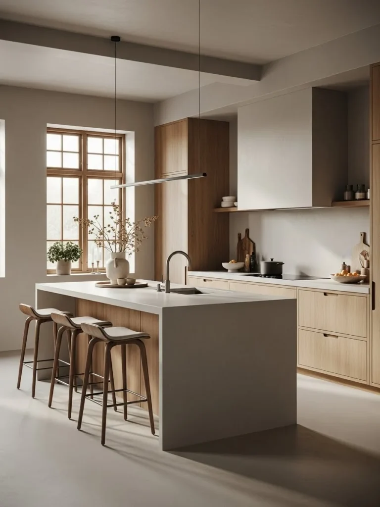 Scandinavian-inspired warm neutral kitchens emphasize simplicity, natural materials, and clean lines, creating a calm and harmonious environment. Soft tones such as warm white, light beige, and muted grey define the palette, fostering a sense of brightness and serenity. Paired with natural wood and minimalist design elements, this style feels both functional and aesthetically refined.