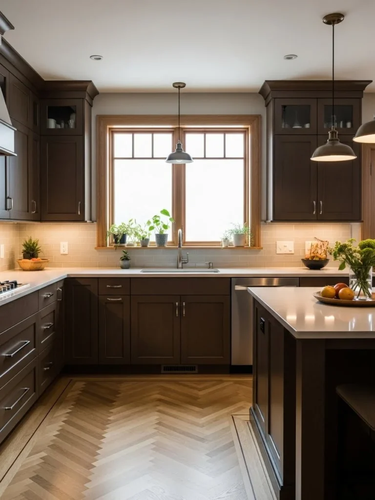 This flooring choice is ideal for homeowners seeking both durability and aesthetic appeal. Herringbone and parquet floors elevate the overall design while maintaining a warm, grounded atmosphere. The result is a kitchen that feels sophisticated, balanced, and timeless—perfect for everyday use as well as elegant entertaining.