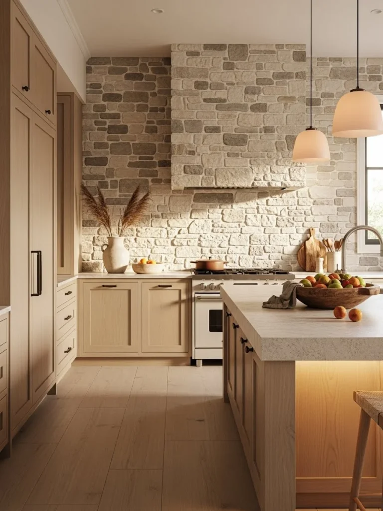 Stone or brick accent walls bring rich texture and natural character to warm neutral kitchens. These materials create a dynamic contrast against smooth cabinetry and soft-toned surfaces, enhancing the overall depth of the design. Warm neutrals such as creamy whites, soft browns, and taupes pair beautifully with natural stone and brick, creating a grounded and inviting atmosphere.