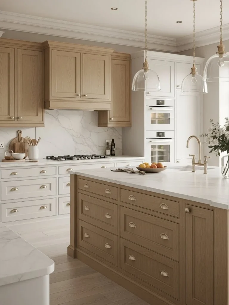 Modern warm neutral kitchens incorporating light oak wood accents create a harmonious balance between contemporary style and organic warmth. Light oak provides natural texture, subtle color variation, and a timeless appeal that enhances the kitchen’s overall aesthetic. Its soft hues also pair seamlessly with neutral palettes, making the space feel bright, clean, and welcoming.