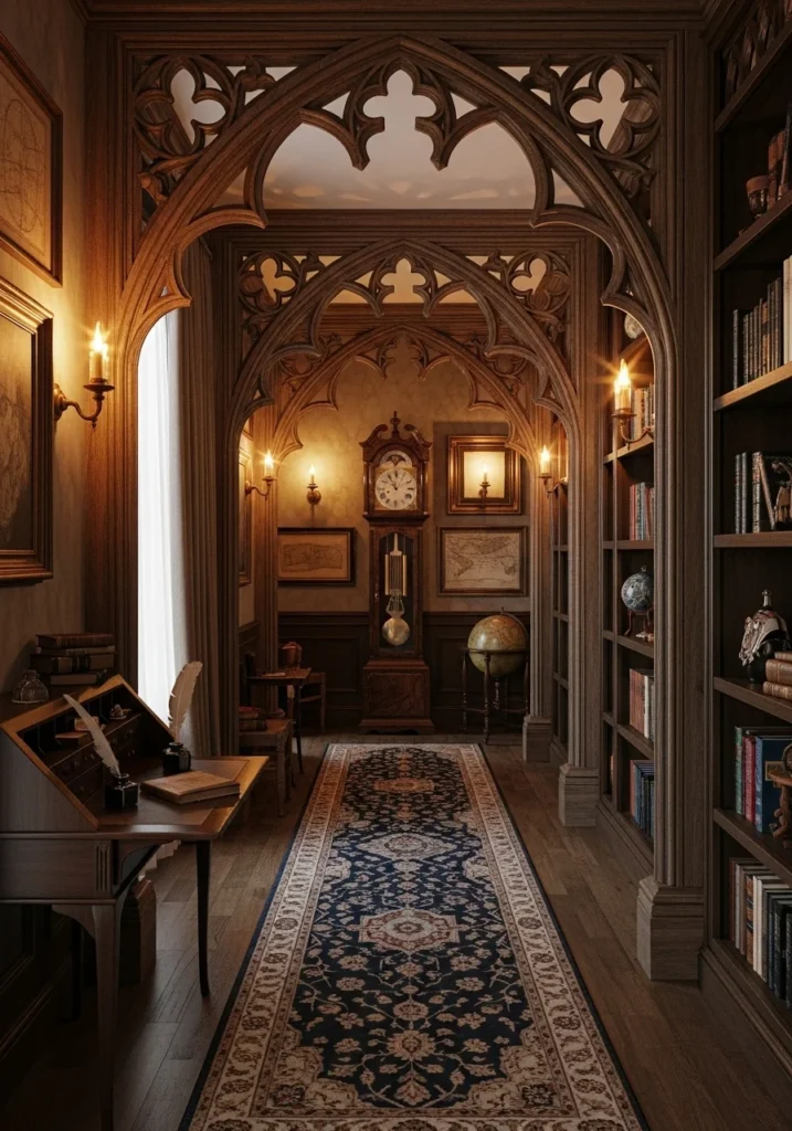 Inside, time feels suspended. The quiet crackle of a candle and the turning of a page are the only sounds that exist. Shadows ripple along carved moldings, creating an atmosphere of both secrecy and serenity. This hidden sanctuary represents the pure essence of dark academia—a devotion to solitude, discovery, and the romantic pursuit of wisdom behind closed doors.