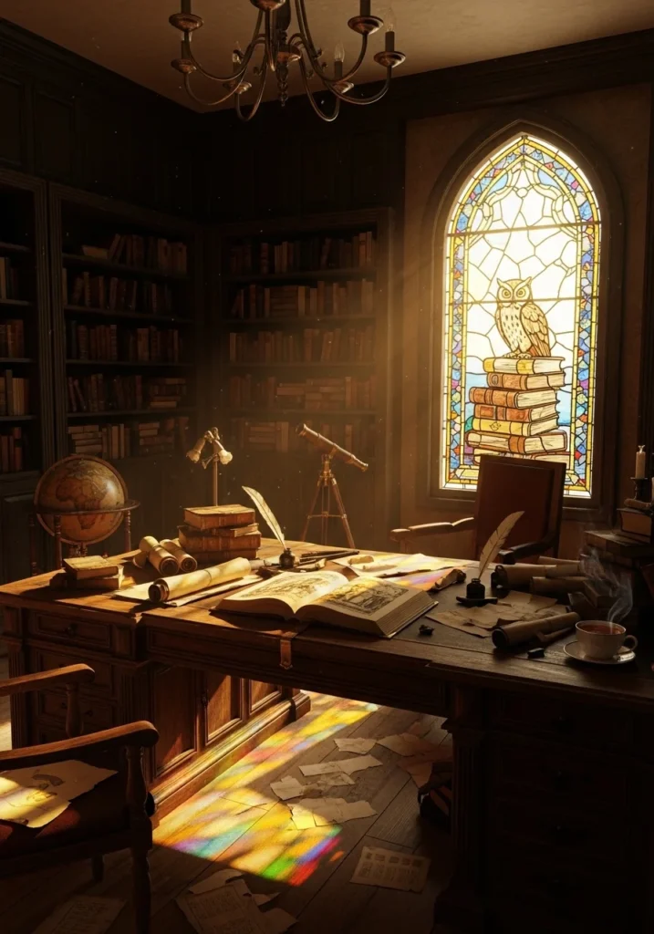 Professor’s study filled with old scrolls, ink pens, and golden sunlight through stained glass