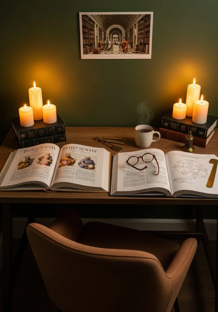 Study nook with candlelit desk, open philosophy books, and moss green walls