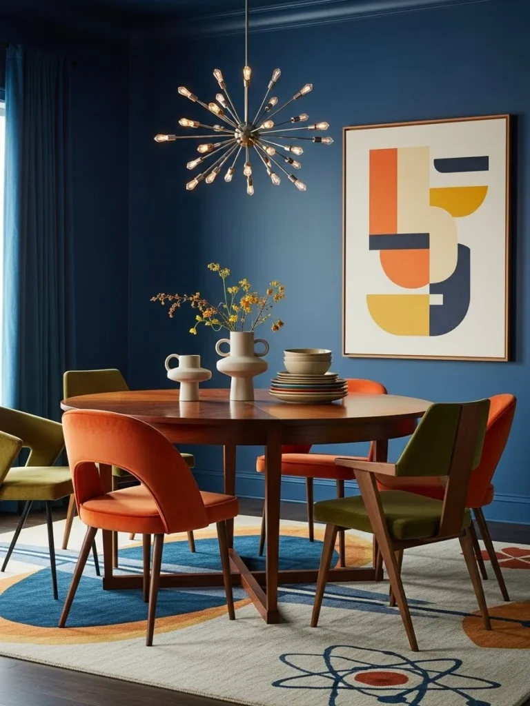 18. Bold vintage modern dining room with deep blue walls and retro furniture silhouettes