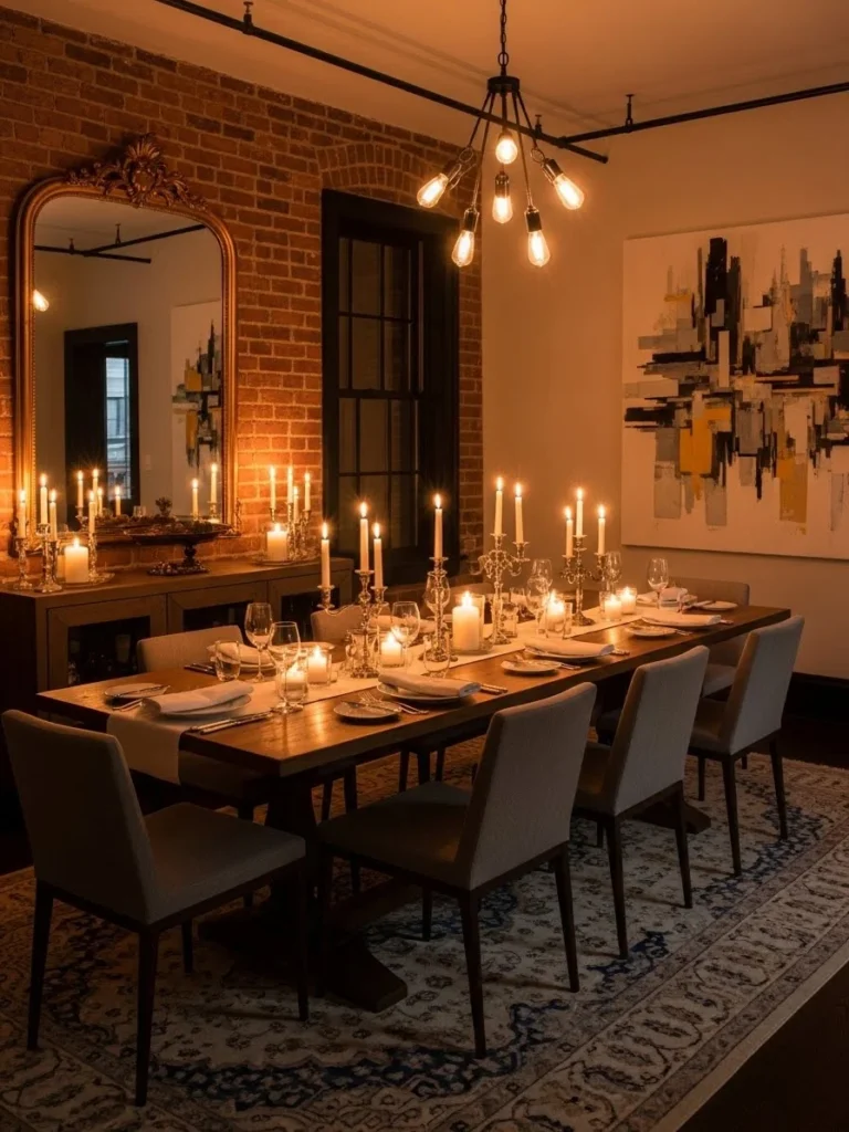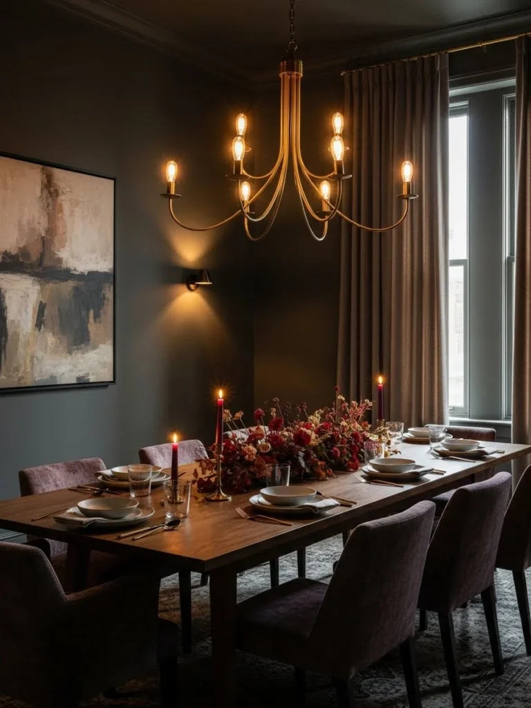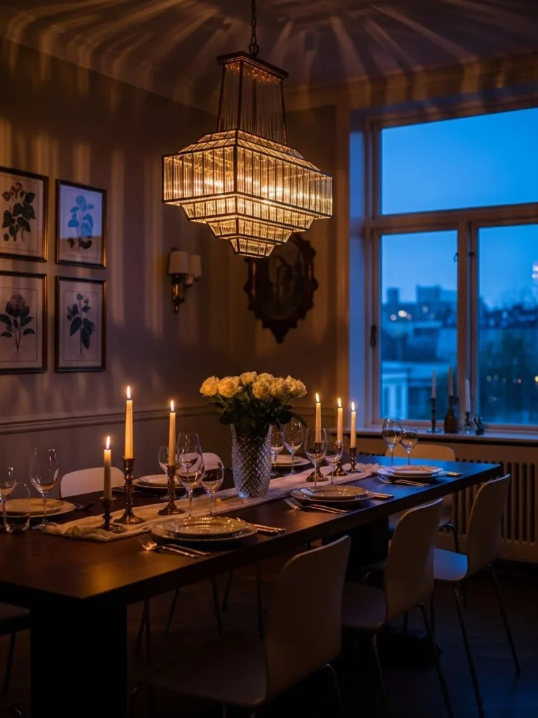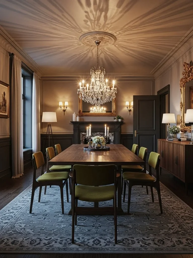 Designed for modern homes, this dining room style prioritizes mood and experience. It offers a sophisticated setting for entertaining and relaxation. The result is a space that feels curated, dramatic, and timeless, blending vintage charm with modern lighting design.