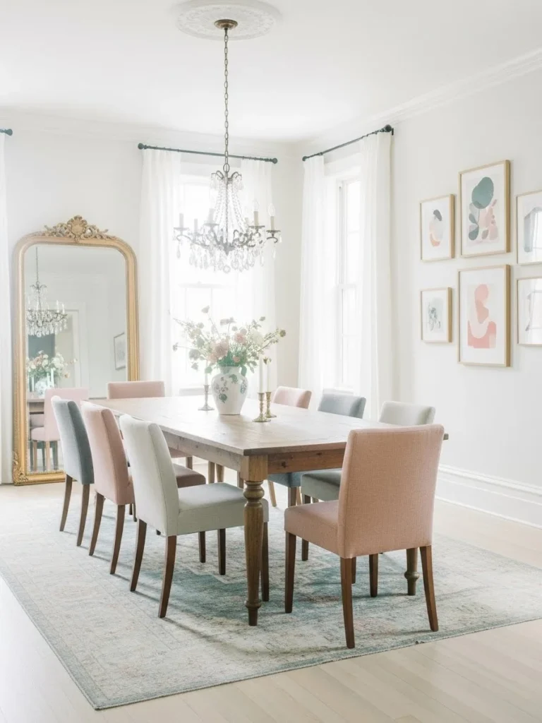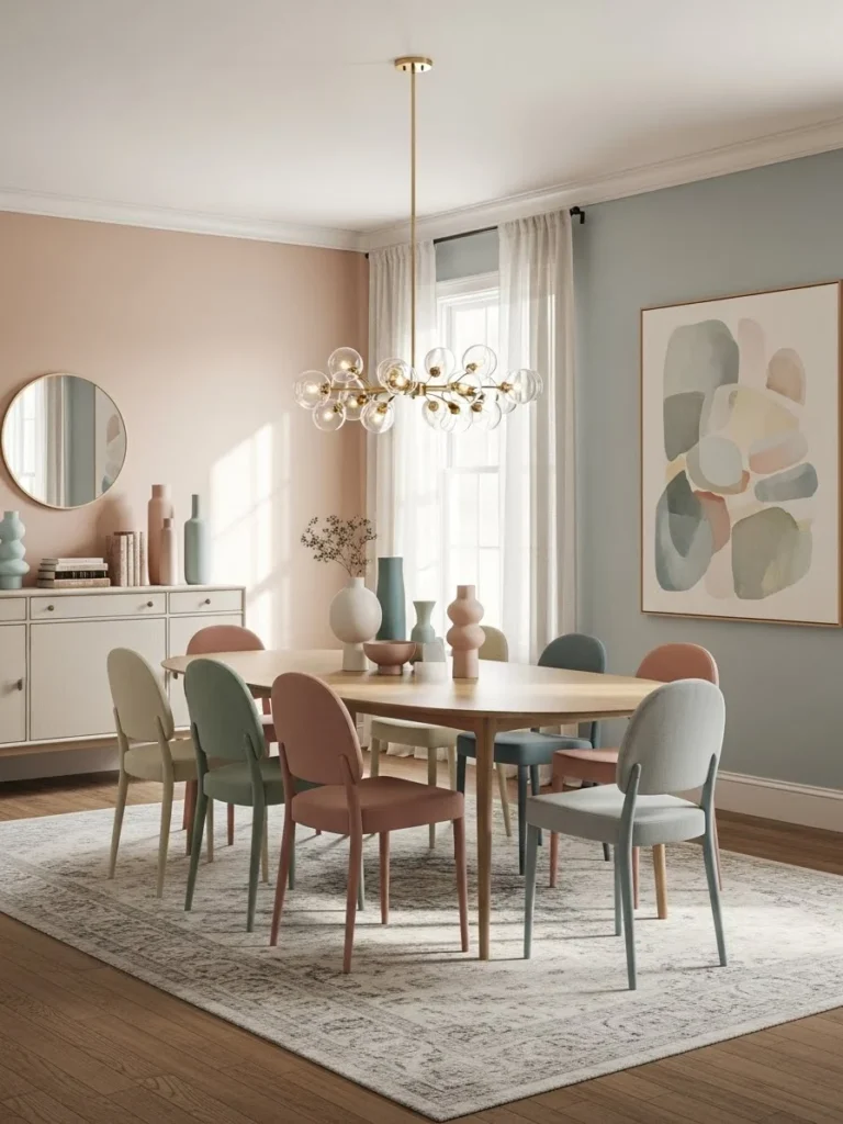 A soft pastel vintage modern dining room offers a gentle and sophisticated approach to color. Muted tones such as blush, sage, or pale blue create a serene backdrop that feels light and welcoming. These hues subtly reference vintage aesthetics while maintaining modern restraint.