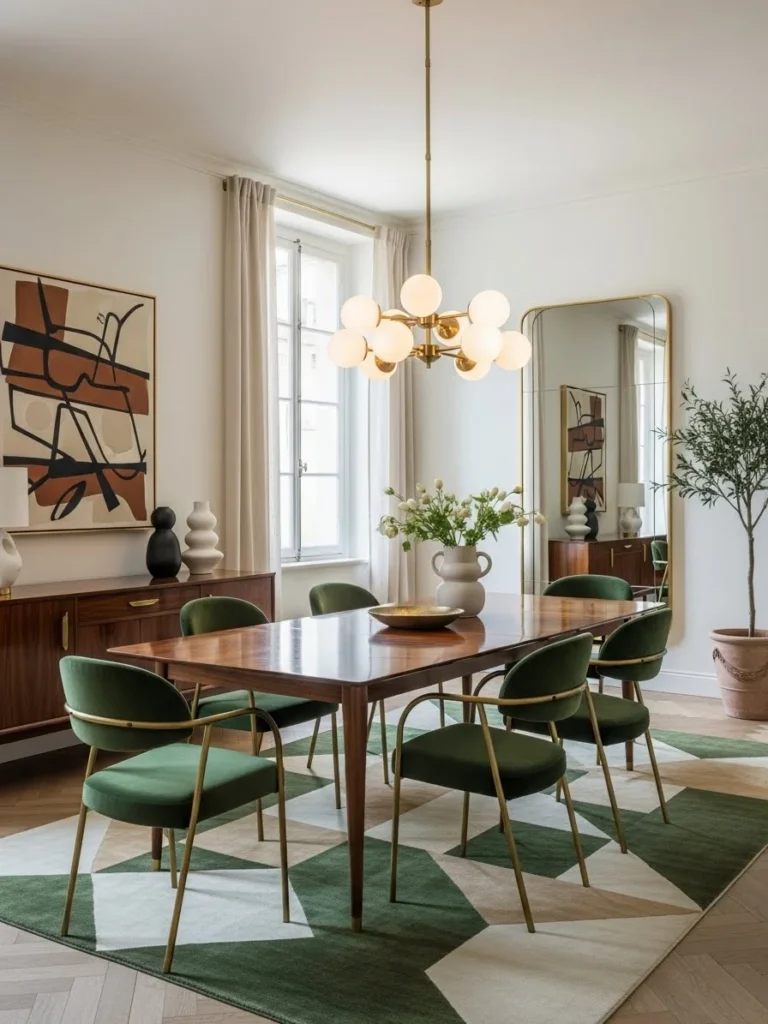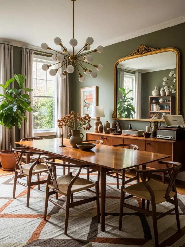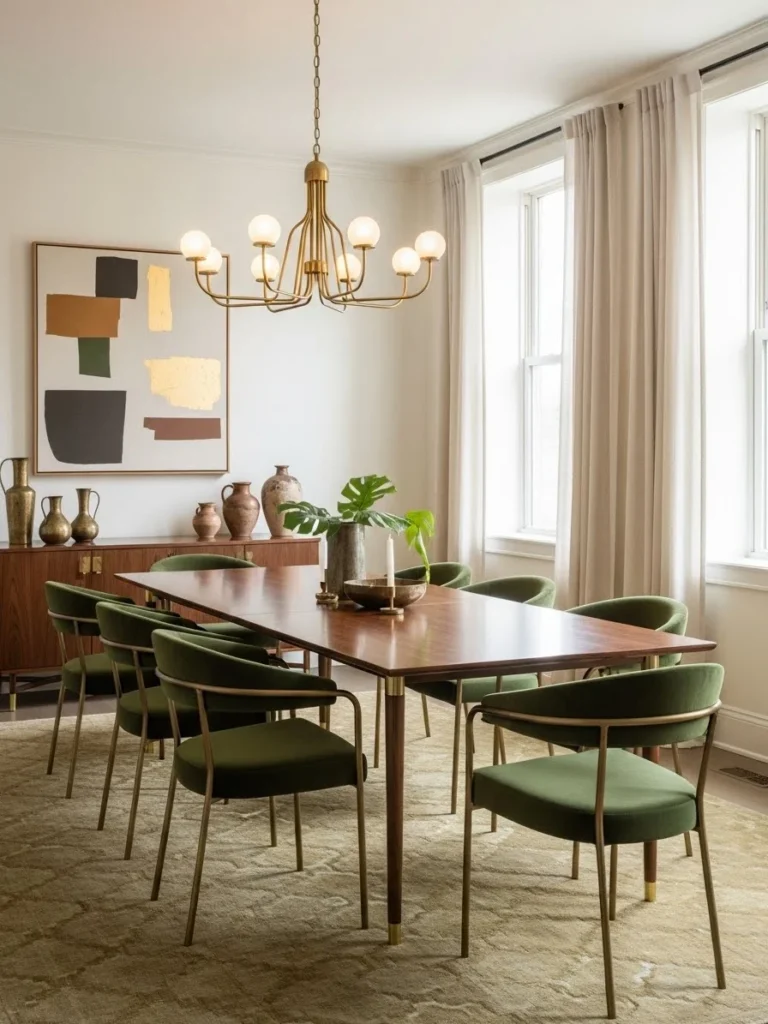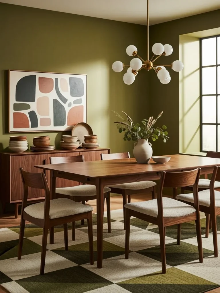 An earth-tone vintage modern dining room creates a grounded and sophisticated atmosphere through a rich, natural color palette. Olive green walls provide depth and warmth while serving as a refined backdrop for vintage-inspired furnishings. This earthy hue enhances the room’s sense of calm and connects the space to nature.