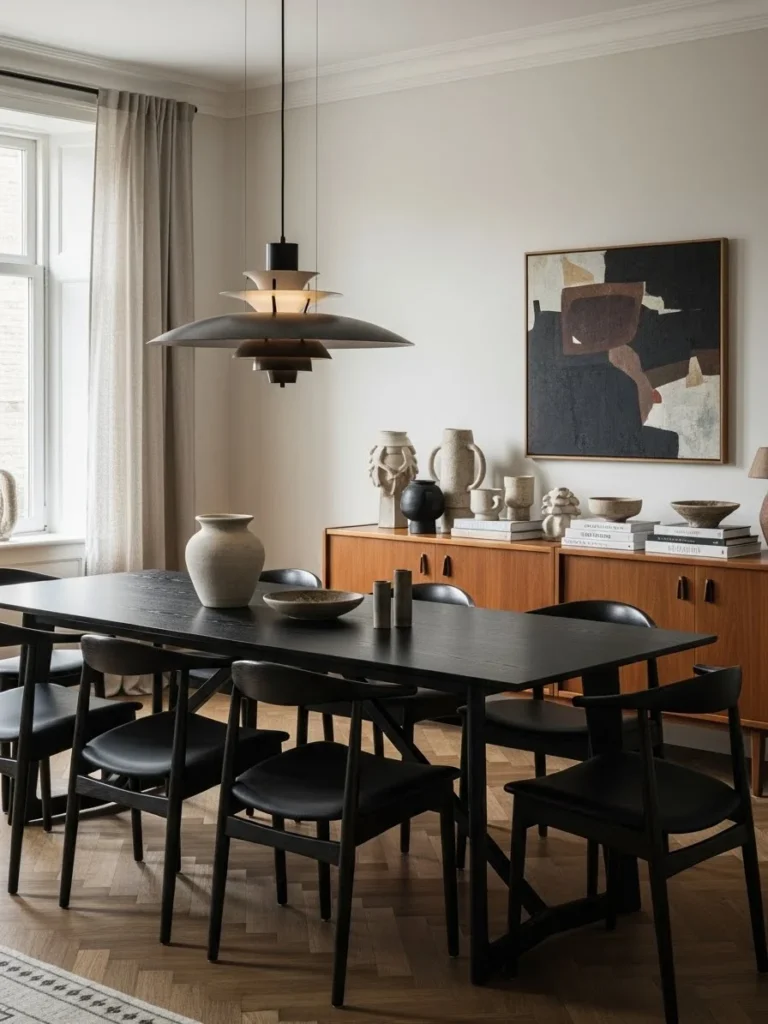 This dining room style is perfect for modern homes seeking drama and elegance. It encourages slower moments, conversation, and a sense of exclusivity. The careful interplay of vintage charm, modern restraint, and atmospheric lighting results in a dining space that feels luxurious, cozy, and timeless.