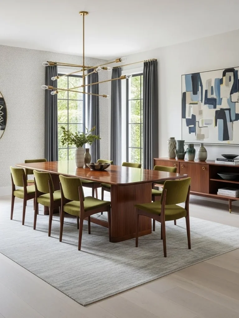 Ideal for editorial photography, design showcases, or branding, this style captures the essence of curated interiors. The space feels polished, purposeful, and visually engaging, highlighting the elegance and versatility of vintage modern dining rooms.