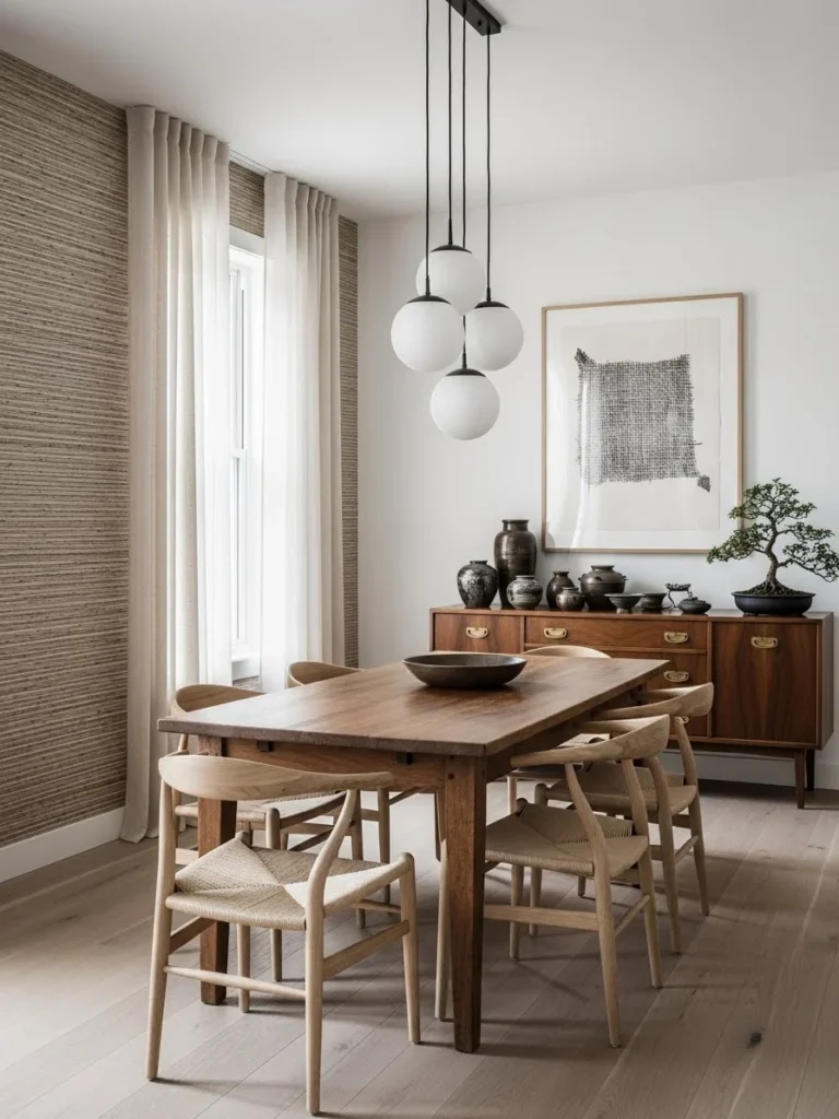 A Japanese-inspired vintage modern dining room focuses on simplicity, balance, and natural materials. Clean lines define the space, creating a sense of calm and order. This minimalist approach allows textures and craftsmanship to stand out.