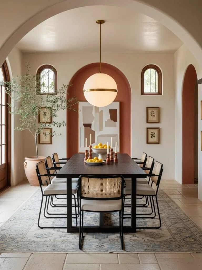 25. Mediterranean vintage modern dining room with arched details and modern furnishings