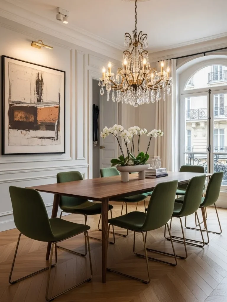 A Parisian vintage modern dining room blends classic architectural elegance with contemporary refinement. Decorative wall molding and subtle detailing provide a timeless backdrop, reflecting traditional Parisian interiors. These elements add depth and sophistication without overwhelming the space.