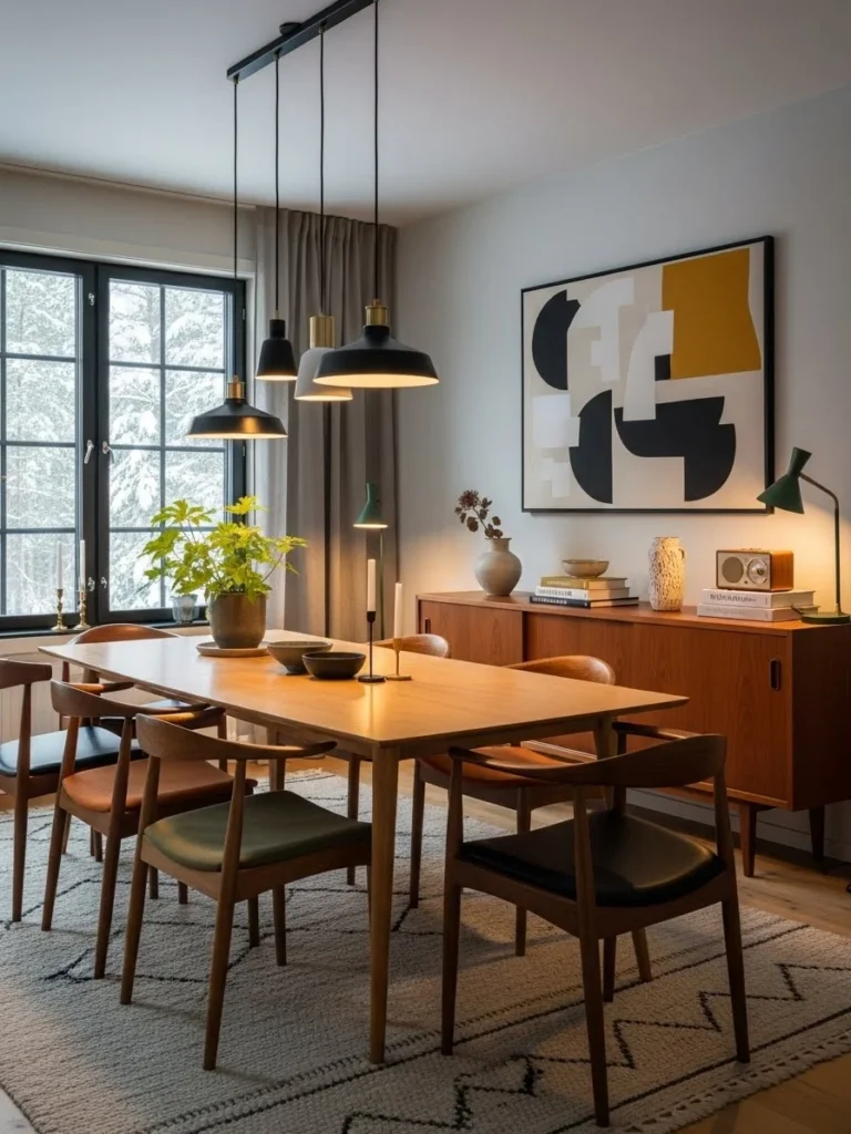 22. Scandinavian vintage modern dining room with minimalist decor and retro warmth