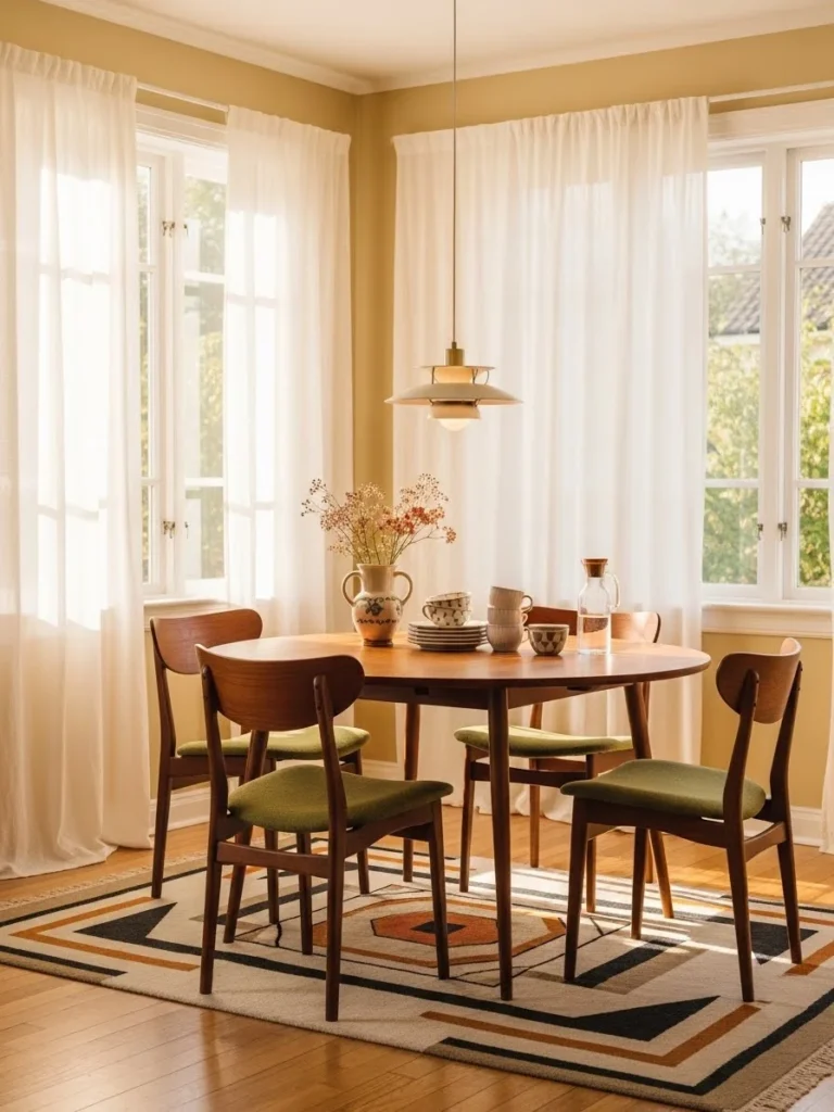 07. Sun-filled vintage modern dining room with sheer curtains and retro dining set