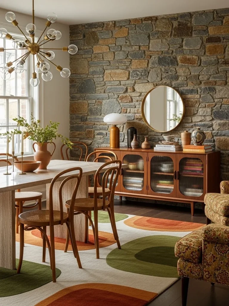 15. Textured vintage modern dining room blending natural stone and retro elements