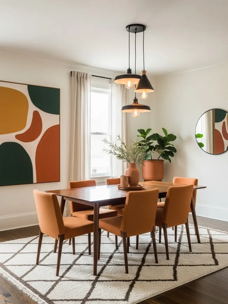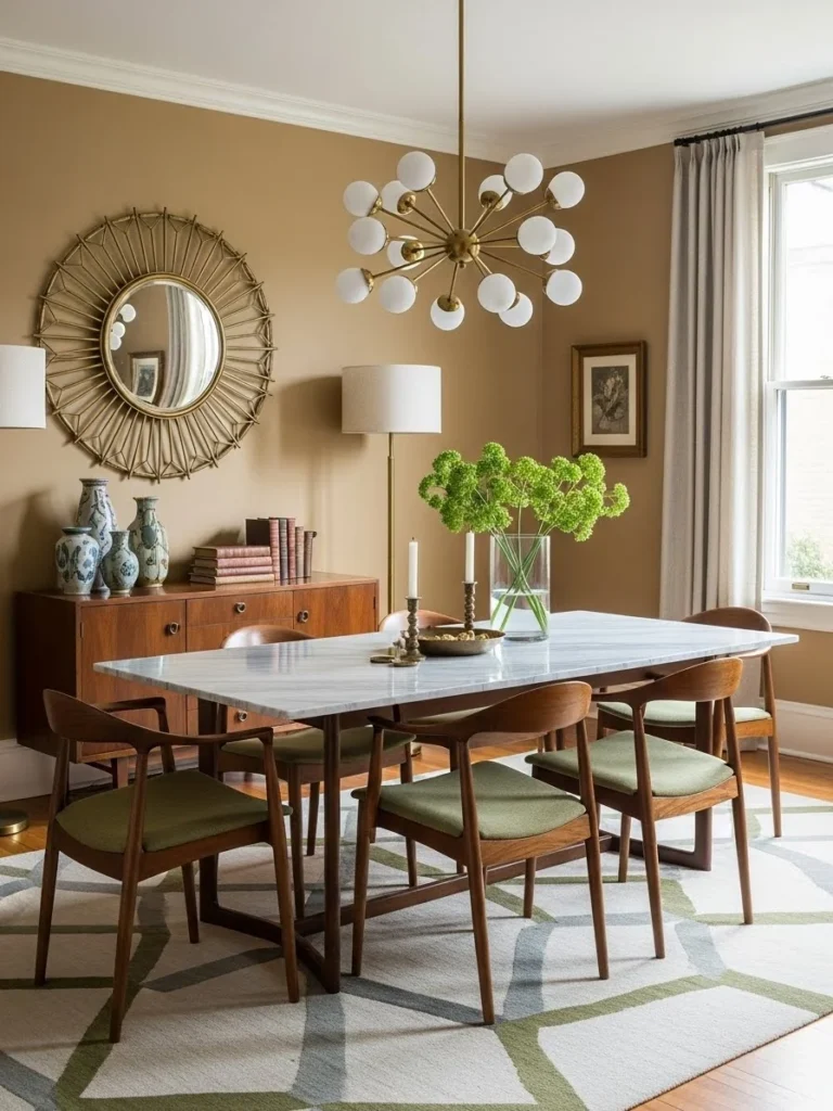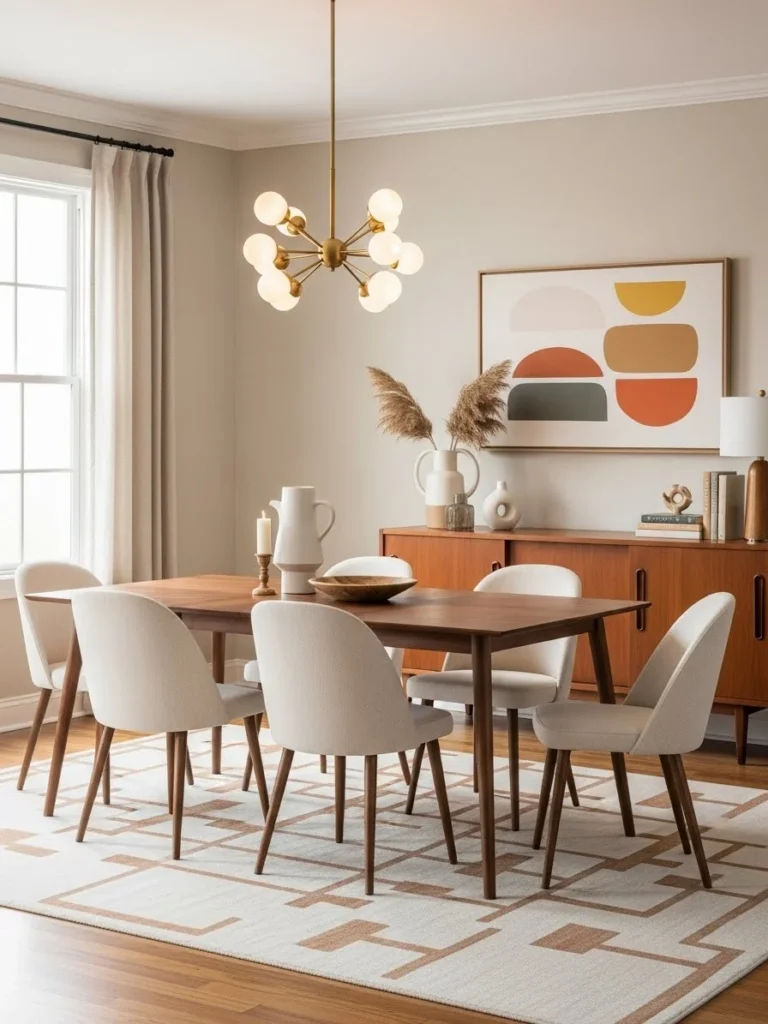 04. Timeless vintage modern dining room with clean lines, warm neutrals, and subtle retro accents