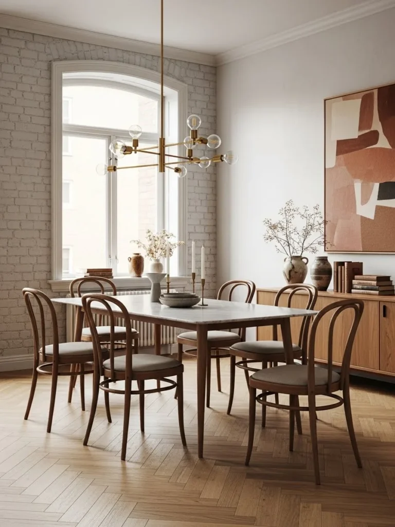 A Scandinavian vintage modern dining room emphasizes simplicity, functionality, and warmth. Minimalist decor creates a clean and uncluttered environment, while soft neutral tones enhance brightness and openness. The overall aesthetic feels calm and intentional.