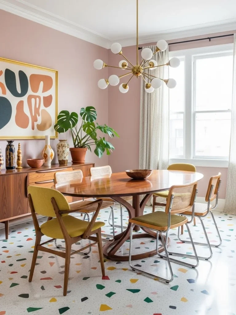 12. Vintage modern dining room featuring terrazzo flooring and retro dining furniture