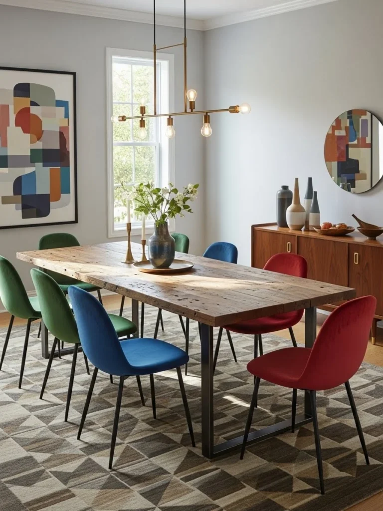 Modern velvet chairs introduce softness and contemporary elegance. Their smooth texture and refined silhouettes balance the rustic quality of the table, creating visual harmony. Rich yet muted tones enhance sophistication without overpowering the space. Clean lines and subtle finishes ensure the room remains cohesive and modern.