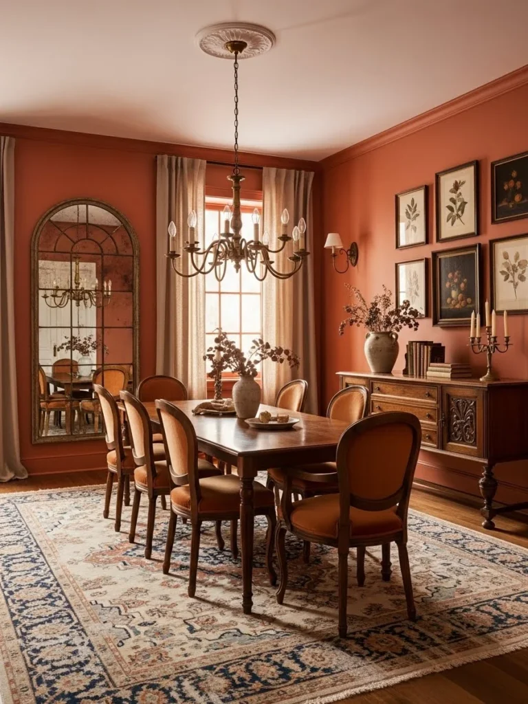 A warm terracotta vintage modern dining room draws inspiration from classic European interiors. The terracotta hue introduces warmth, depth, and earthy sophistication, creating a welcoming dining atmosphere. This color enhances texture and adds character to the space.