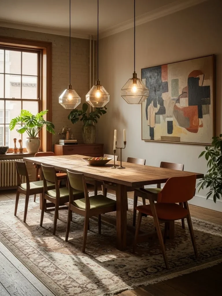 01. Vintage modern dining room with mid-century table, modern pendant lighting, and warm wood tones