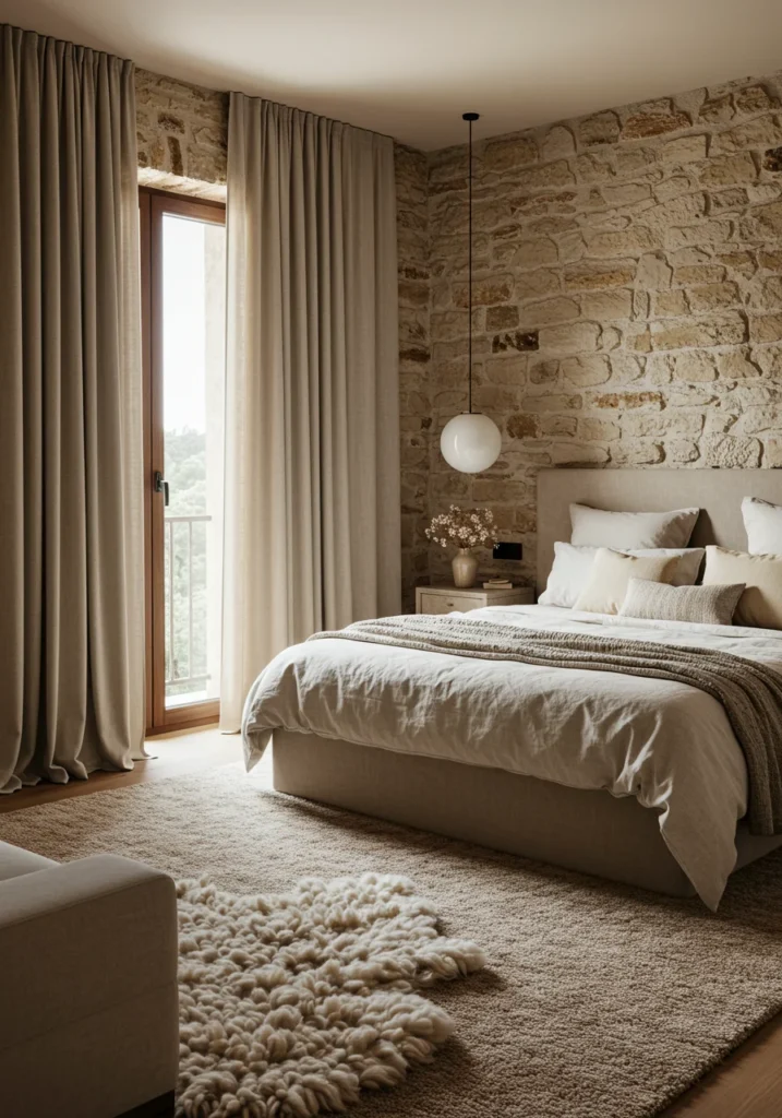 Earthy luxury bedroom with stone walls, neutral hues, and soft textiles