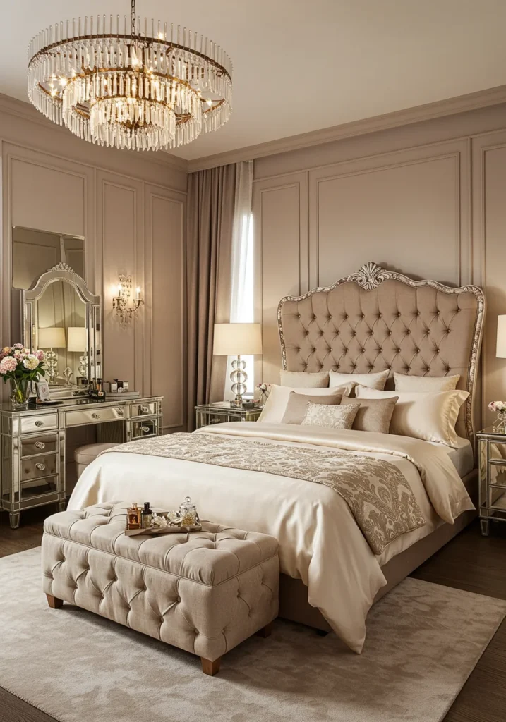 Glamorous bedroom with tufted headboard, mirrored furniture, and silk bedding