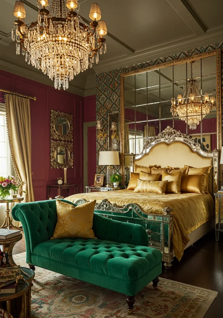 Hollywood Regency-style bedroom with bold colors and statement mirrors