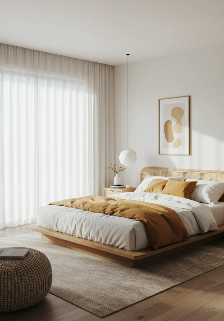 Japandi-inspired luxe bedroom with natural materials and calming palette