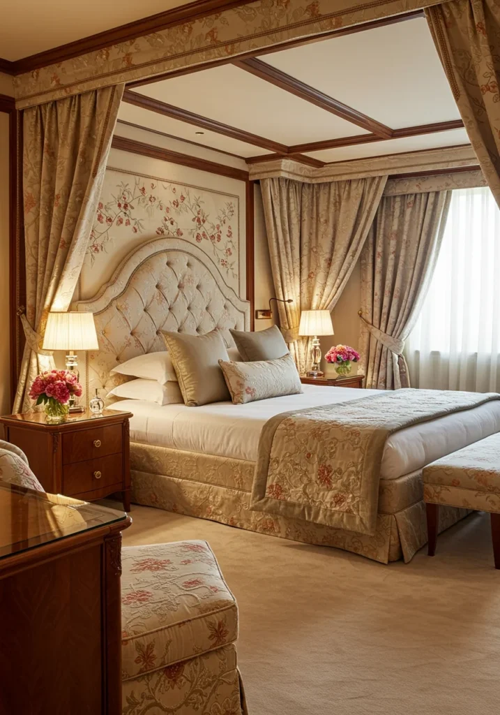Luxe bedroom with layered fabrics, warm lighting, and floral details