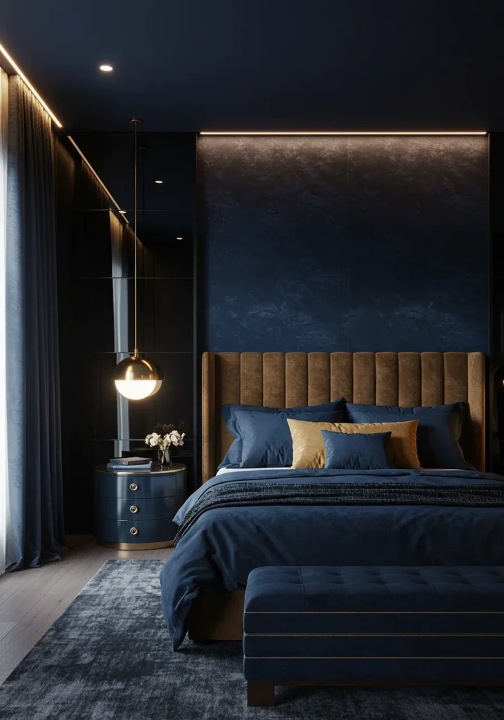 Luxe bedroom with navy tones, smoked glass panels, and textured fabrics