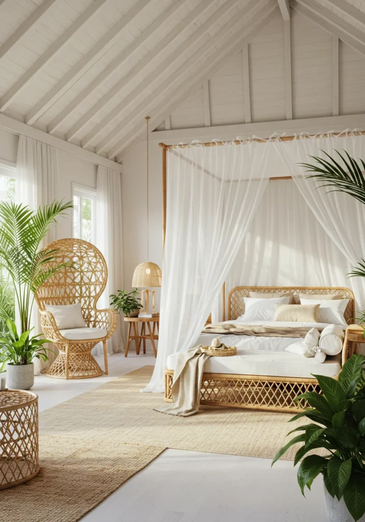 Tropical resort-style bedroom with rattan furniture and airy canopy bed