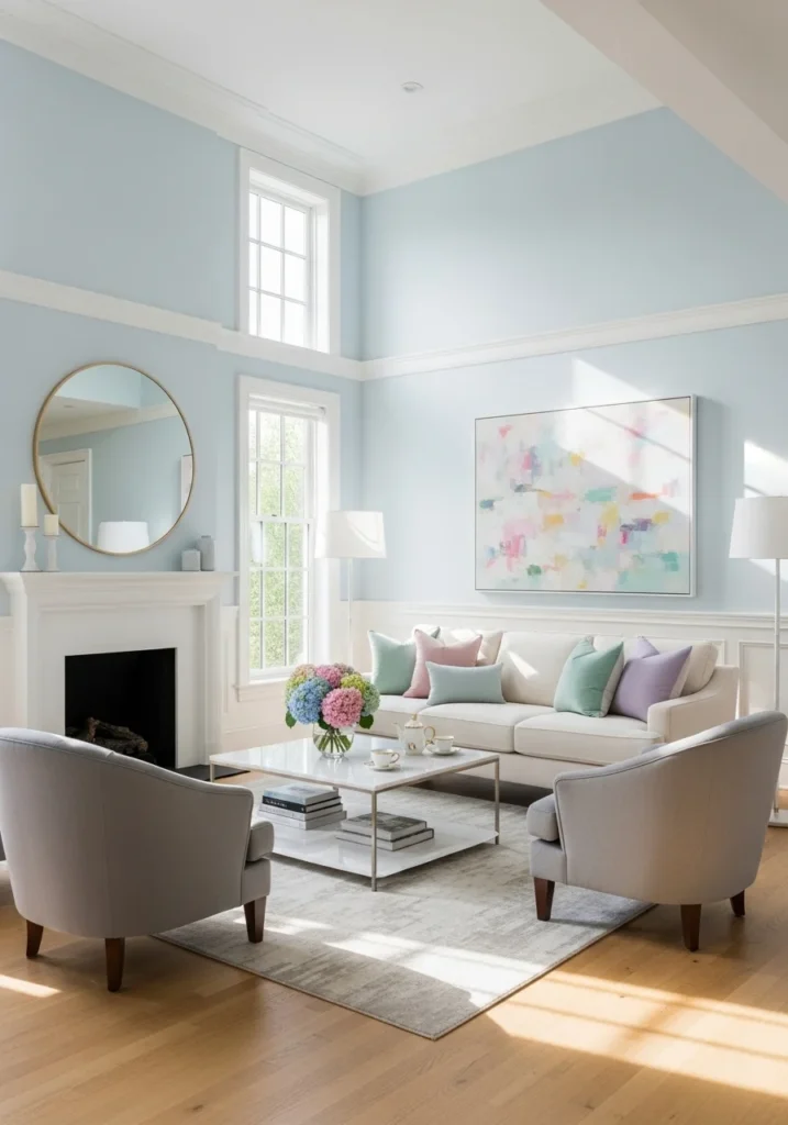 15. Airy Modern Classic Living Room with Soft Pastel Palette