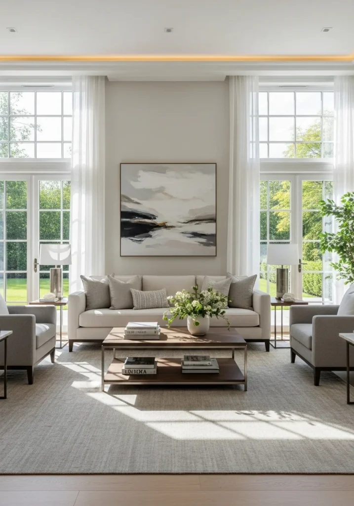 This bright modern classic living room is defined by expansive windows that flood the space with natural daylight. Flowing curtains soften the architectural lines, while light beige tones establish a serene and elegant atmosphere. The design prioritizes openness and calm, resulting in a refined yet inviting environment.