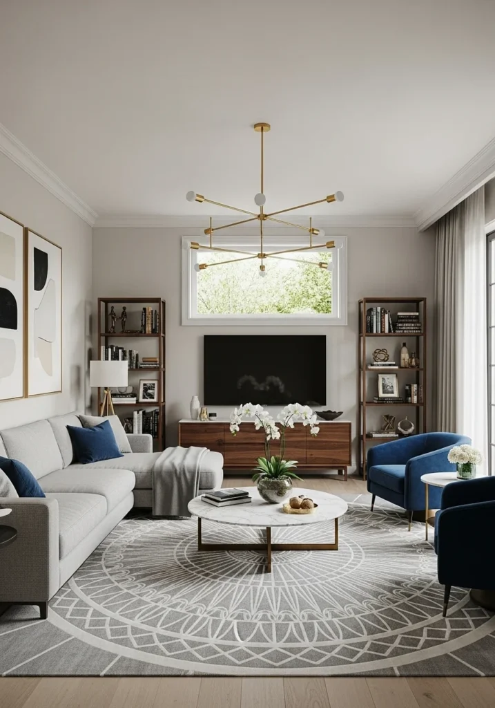 This elegant modern classic living room is anchored by a refined marble coffee table that introduces understated luxury and visual focus. A plush luxury rug adds warmth and texture, while curated décor elements enhance the room’s sophisticated character. The composition emphasizes balance and timeless refinement.