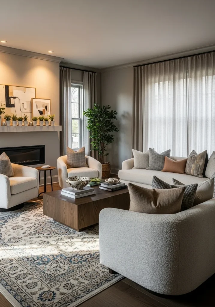This cozy modern classic living room prioritizes comfort and warmth through plush seating and soft layered textures. Muted tones and refined fabrics establish a calm and inviting environment while maintaining an elegant aesthetic. The design encourages relaxation without compromising luxury.