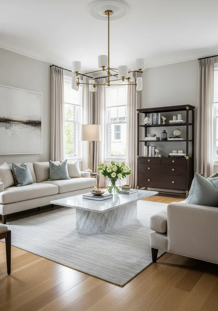 20. Elegant Modern Classic Living Room with Marble Coffee Table