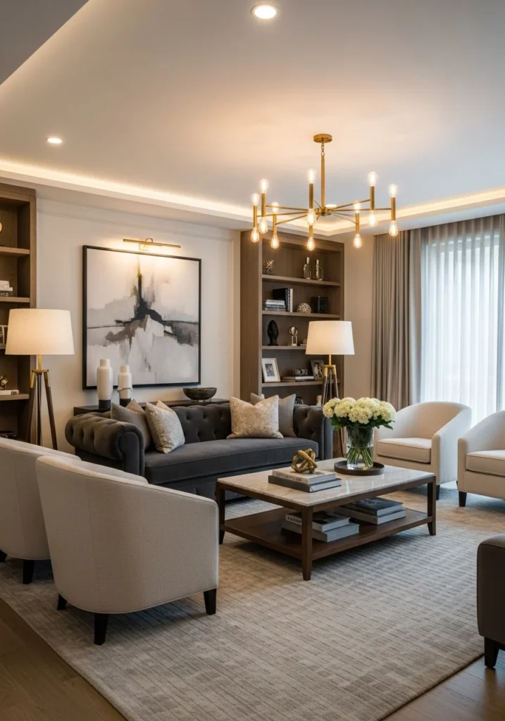 This modern classic living room is elevated by a striking statement chandelier that serves as the central visual feature. Neutral tones and polished marble accents establish a refined foundation, allowing the chandelier’s sculptural form to command attention. The design achieves a sophisticated balance between classical elegance and contemporary clarity.