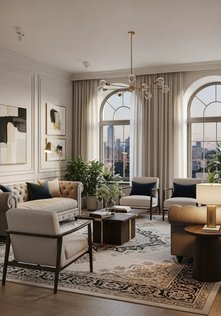 Ideal for upscale residences and sophisticated apartments, this living room embodies timeless appeal. It offers a luxurious, comfortable environment where modern classic design meets refined everyday living.