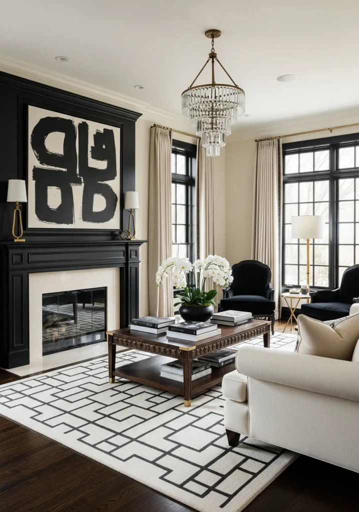 16. Modern Classic Living Room with Black and Cream Contrast Palette
